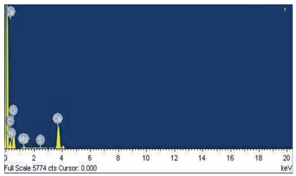 活性炭的表面化學(xué)成分是通過(guò)使用能量色散X射線(EDX)光譜確定的。得到的光譜見(jiàn)圖2,C、N、0、Mg、Ca的百分比分別為7.64%、14.53%、35.31%、0.70%、41.80%。FTIR結(jié)果支持C、N和O的存在,該結(jié)果表明存在羰基和胺基團(tuán)。除此之外,高百分比的Ca表明主要是鈣的性質(zhì)。此外,光譜中出現(xiàn)Mg表明Mg化合物與碳和氧強(qiáng)烈結(jié)合。因此,無(wú)論是用熱蒸餾水還是冷蒸餾水,都不容易通過(guò)洗滌去除。