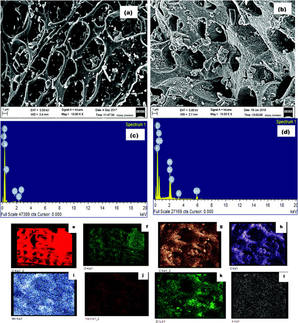 同時,EDX結果也證實了用KMnO 4和氯氧化鋯的氧化過程顯著增加了載鋯活性炭上的氧部分。元素組成結果要求Zr金屬元素在碳表面上的含浸量為14%。其他氧化元素的存在,即氧氣和錳也證實了載鋯活性炭內在的氧化活性。在改性過程中,與未加工的活性炭相比,氧部分變成了兩倍以上,而活性炭對于應用部分則顯示出良好的征兆。因此,FE-SEM和EDX映射的結果聯合顯示,這種改性將原始活性炭的結構模式改變為具有更多孔的更粗糙的含氧表面,這將有助于其應用。