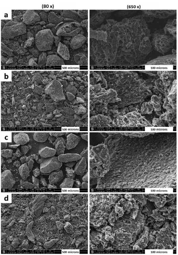 我們使用現代分析技術來了解制備的活性炭催化劑的真實性質,掃描電子顯微鏡(SEM)是查看材料形態的強大工具。圖1顯示了四種活性炭樣品的SEM圖像。圖像是在兩個不同的分辨率,以比較不同比例的樣本。評估不同煅燒溫度的影響是很重要的。圖1的左側圖像顯示,無論煅燒溫度如何,所有樣品的表面都被各種亞微米大小的顆粒所掩蓋,并且表面上存在許多明顯的解理。不同煅燒溫度下的熱解對活性炭樣品的形貌影響不大,但有輕微的變化,如一些顆粒從表面被去除,一些解理被侵蝕。此外,從這些SEM圖像可以推斷,這些活性炭材料中的許多微孔結構使其成為任何化學反應中反應物相互作用的極好載體。