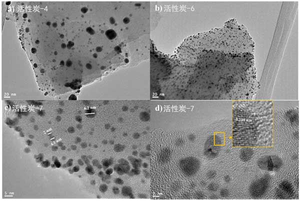 為了進一步研究金顆粒在活性炭表面的分布和結晶度,我們拍攝了鍍金活性炭樣品的透射電子顯微鏡圖像。圖7顯示了各種活性炭樣品在不同放大倍數下的TEM圖像。圖2a、b顯示了金納米粒子在活性炭表面上的分布。很明顯,兩個樣本的分布是均勻的。活性炭-4和活性炭-6似乎都以類似的方式相互作用和承載金納米粒子。活性炭-7樣品的高分辨率TEM圖像如圖2c、d所示。圖2c顯示大多數金納米顆粒很小,直徑為3-5nm,并且只能看到少數團聚顆粒。圖2d顯示了金的晶格條紋間距。發現晶格條紋間距為0.217nm,對應于金晶面的面。此外,我們試圖通過TEM圖像估計顆粒尺寸的分布,我們發現所有樣品中超過80%的金顆粒的尺寸小于5nm。