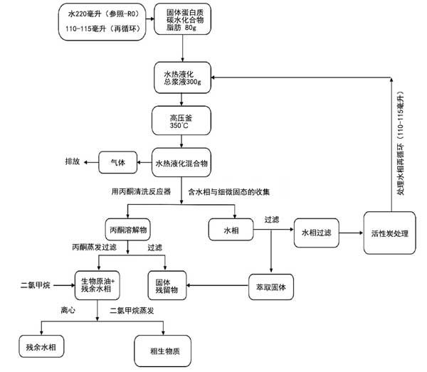 圖1:水熱液化加工與產品分離程序示意圖。