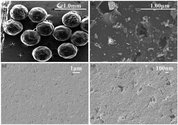 SEM被用于研究活性炭的形態(tài)、表面粗糙度和粒度。其內(nèi)部孔隙結(jié)構(gòu)信息也可以通過橫截面的SEM進(jìn)行分析。SEM圖像顯示球型活性炭具有均勻的球形,粒徑(直徑)約為600μm(圖1a)。表面比較光滑,有較大的裂紋和孔隙結(jié)構(gòu),表面有許多無序的微晶結(jié)構(gòu)(圖1b)。橫截面顯示了一些分布均勻的相對均勻的孔隙(圖1c和1d)。