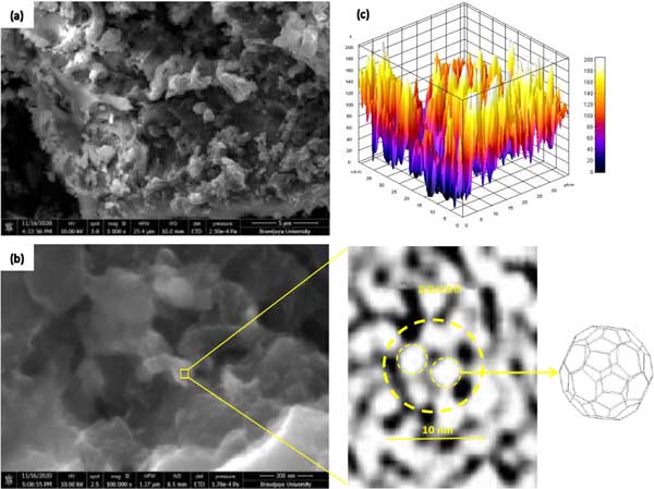 圖1:(a)放大5000倍的活性炭表面形態(b)活性炭內的富勒烯簇(c)表面電荷。