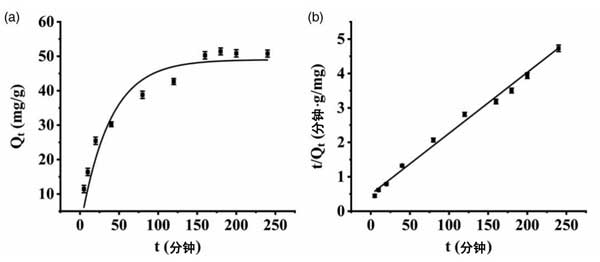 圖3:(a,b)改性活性炭的擬一級動力學吸附曲線和擬二級動力學吸附曲線。