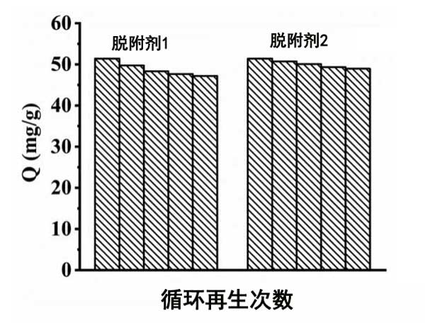 改性活性炭的回收利用在實際應用中具有重要意義,因為它可以降低生產成本,節省時間。為了研究改性活性炭回收的重要指標,我們考慮了吸附劑活性基團的性質。在本研究中,對兩種改性后的活性炭進行再生。將0.1g改性活性炭吸附的鎘離子分別放入兩種溶液中,在恒溫震蕩器中放置6小時進行解吸再生。然后重復吸附和解吸實驗5次,樣品溶液再吸附鎘離子的溶解度為0.1g/L。圖4表明0.1mol/L聚乙烯多胺溶液是改性活性炭的合適再生劑,因為聚乙烯多胺具有很強的絡合能力,可以在不破壞吸附劑原有結構的情況下解吸金屬離子。這些結果證明活性炭不僅具有較高的去除率,而且具有良好的回收性能,具有良好的應用前景。