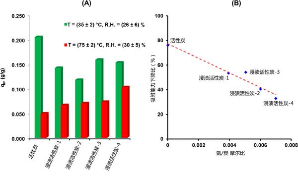 甲基碘吸附容量的降低程度取決于活性炭的性質(zhì)(圖2(A))。正如預(yù)期的那樣,對(duì)于未浸漬的吸附劑觀察到有害的影響,其中僅已知不涉及CH3I吸附的特定相互作用。更準(zhǔn)確地說(shuō),當(dāng)從活性炭材料的第一組條件轉(zhuǎn)移到第二組條件時(shí),概述了大約76%的吸附容量下降(圖2)。在這方面,為了克服與水蒸氣和溫度相關(guān)的影響,三乙二胺浸漬是必不可少的。最近,由于水對(duì)三乙二胺分子具有很強(qiáng)的親和力,因此三乙二胺浸漬可以通過(guò)釋放載體的活性位點(diǎn)來(lái)提高活性炭的保留性能]。此外,與其他機(jī)制(尤其是物理吸附)相比,化學(xué)吸附甲基碘的比例隨著溫度升高而增加。然后,三乙二胺與甲基碘的化學(xué)反應(yīng)性將在較高溫度下增強(qiáng)。得到的結(jié)果(圖2)表明隨著氮含量的增加,在“惡劣條件”下的保留性能逐漸提高。因此,以浸漬中含量最高為特征的活性炭-4吸附劑的吸附容量?jī)H降低了33%。更準(zhǔn)確地說(shuō),可以推斷出所有考慮的吸附劑的減少幅度和摩爾比之間的準(zhǔn)線(xiàn)性關(guān)系(圖2B)。根據(jù)這種關(guān)系,似乎需要浸漬,以確保在更嚴(yán)格的條件下更牢固地固定甲基碘。