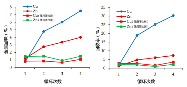 圖4:使用活性炭和不使用活性炭進行水處理時,Cu和Zn的品位和對粗銅精礦的回收率。