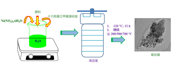 在氧化鎳的典型合成過程中,將硝酸鎳與去離子水一起在環境溫度下保持在燒杯中,同時進行磁力攪拌。然后,將六烷基三甲基溴化銨分散在去離子水中,并在攪拌條件下緩慢加入上述溶液中。隨后,將預先活性炭原材料放入上述反應混合物中。最后,將制備好的溶液移入聚四氟乙烯襯里的不銹鋼(SS)高壓釜中。高壓釜在馬弗爐中保持在120℃中12小時。反應完成后,使高壓釜在環境溫度下冷卻。收集所得材料并用大量去離子水和乙醇沖洗以除去未反應的材料/溶劑。清潔后的材料在真空烘箱中在80℃下脫水放置。最后,將干燥的樣品在空氣氣氛下在三種不同的溫度(300、500和700℃)下粉碎和燒結2小時。最終衍生材料根據其煅燒溫度來區分材料。制備方法的圖示表示在圖1展示。