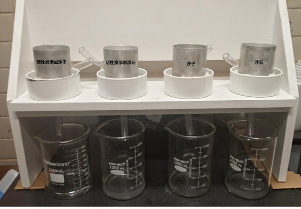 酸二氫鉀在去離子水中制備磷溶液,將活性炭稱重到試管中,,并用36mL的16.3mg/L-1正磷酸鹽平衡,僅包括沙子或浮石樣品。將管在端到端振蕩器上以90min-1的頻率平衡24小時,并通過0.2-μm膜過濾器過濾上清液。根據(jù)鉬酸鹽法,使用UV-VIS分光光度計分析濾液中的正磷酸鹽。總共16根柱子(直徑7.62厘米,高7.62厘米)用沙子或浮石填充到4.56厘米的深度(圖2)。十六列對應于由兩種過濾器(沙子或浮石)和四種活性炭改進材料組成的實驗,包括對照(無添加活性炭),一式兩份。將含活性炭改良劑和不含活性炭改良劑(按重量計5%)的沙子或浮石混合,然后將其干填充到柱中。每個柱子的底部都用粗棉布保護,這樣可以大限度地減少過濾材料的損失。