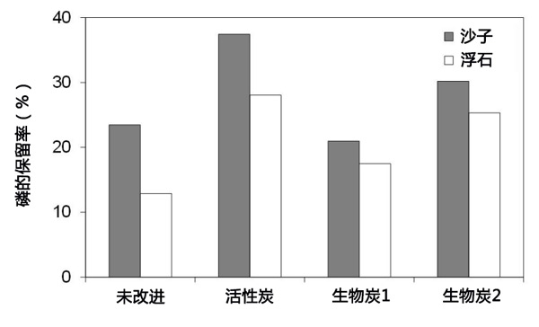 通過浸出的磷累積量與施用的磷量估計的磷保留(%)顯示了活性炭改進的沙子和浮石柱的區(qū)別圖4。活性炭改進的砂柱產(chǎn)生很高的磷保留(37%),其次是活性炭改進的砂柱保留(30%)。僅浮石柱在磷保留方面的效果最差(13%)。總體而言,在任何活性炭改進中,砂柱產(chǎn)生的磷保留比浮石柱高4-10%。這種差異可能歸因于砂柱比浮石柱的體積密度更大,粒徑更細,從而使磷在砂柱中的保留時間更長。