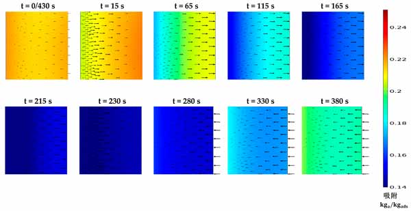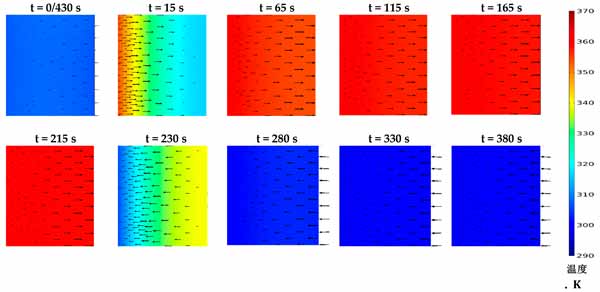 活性炭復(fù)合吸附劑的壓力和溫度決定了平衡吸收,它代表了在給定時間分別在吸附和解吸階段可以達(dá)到的最大和最小吸收容量。然而,顆粒內(nèi)和顆粒間的傳質(zhì)阻力表明吸附材料在每種給定情況下可以多快達(dá)到其平衡吸收能力。這突出了在本研究中同時求解兩種傳質(zhì)機(jī)制與其他控制方程的重要性,以顯示促進(jìn)傳熱對傳質(zhì)的凈效應(yīng)。圖2顯示了在430秒循環(huán)時間內(nèi),考慮到預(yù)熱和預(yù)冷階段均為30秒的時間間隔內(nèi)代表性部分的固結(jié)吸附劑域的溫度分布。