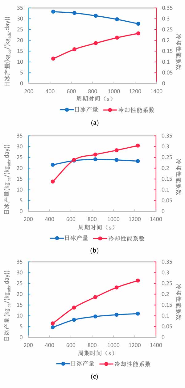 在活性炭厚度為2、5和10mm時,循環(huán)時間的變化對制冰系統(tǒng)的每日制冰量和冷卻性能系數(shù)的凈影響如圖4所示。總體而言,在給定范圍內(nèi)增加循環(huán)時間可以增加或減少系統(tǒng)的每日制冰量,具體取決于活性炭復(fù)合材料的厚度。然而,無論活性炭復(fù)合材料的厚度如何,系統(tǒng)的冷卻性能系數(shù)通過增加循環(huán)時間而增加。盡管如此,系統(tǒng)冷卻性能系數(shù)在1230的較長循環(huán)時間和5mm活性炭復(fù)合材料厚度下達(dá)到其最大值。通過增加活性炭復(fù)合材料的厚度,日冰產(chǎn)量在不同循環(huán)時間內(nèi)的變化范圍顯著減小,這可以通過比較圖4a-c中給出的每日制冰量范圍看出。這歸因于活性炭復(fù)合材料厚度較厚時有效吸收的減少。