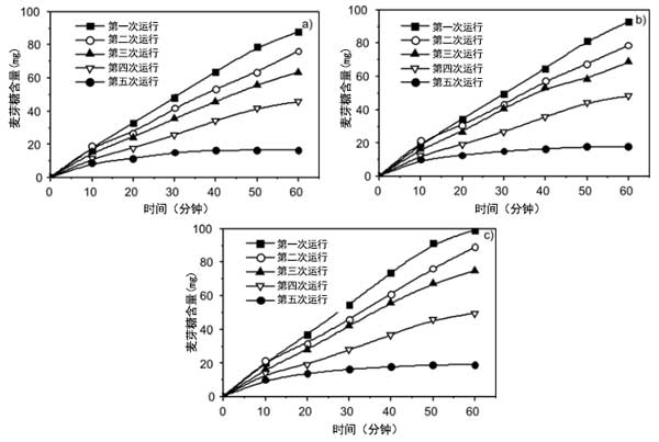 在間歇反應器中檢測游離酶和固定化酶的水解活性。通過將可溶性淀粉溶解在蒸餾水中制備%淀粉溶液,并通過0.1M/HCl將pH值調節至4.7。然后將1g含有α-淀粉酶的活性炭纖維置于測試小瓶中。隨后,加入100cm3的淀粉溶液,并將系統在40℃下不斷搖動的水浴中孵育。每10分鐘抽取1cm3溶液以確定水解麥芽糖的量。通過加入1cm3的3,5-二硝基水楊酸試劑終止反應。還在沸水浴中孵育5分鐘。還原糖(麥芽糖)的量通過分光光度法在540nm處測定。