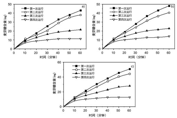 固定化α-淀粉酶水解淀粉在相同活性炭上的α-淀粉酶水解的麥芽糖的量與淀粉濃度無關。麥芽糖也被α-淀粉酶水解:結果表明,如果固定發生在相同的活性炭上,則水解麥芽糖和水解淀粉的量保持不變。這表明淀粉濃度是足夠的。固定在ACF上的淀粉酶的量越大,水解麥芽糖的量就越高。對于活性炭-0,第一次運行60分鐘后水解麥芽糖的量為20mg。第二輪下降到12毫克,第三輪下降到8毫克。對于活性炭改性纖維,第一次運行60分鐘后水解麥芽糖的量為100mg。吸附的淀粉酶在運行3次后仍保持較高的水解活性。第四次運行后其活性下降,麥芽糖量為50毫克。對于活性炭,第一次運行60分鐘后水解麥芽糖的量為50mg。吸附的淀粉酶在兩次運行后保持較高的水解活性。3次運行后其活性降低,麥芽糖量為20mg。固定化酶最重要的優點是它的可重復使用性。活性炭纖維的表面基團也影響α-淀粉酶的解吸行為。固定在活性炭-0上的α-淀粉酶在水解過程中大部分會被解吸,2次運行后固定在活性炭-0上的α-淀粉酶的保留活性為10%。然而,固定在改性活性炭和活性炭-HNO3上的α-淀粉酶在4次運行后表現出超過24%和14%的活性。