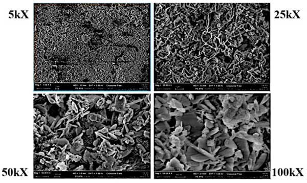 采用掃描電子顯微鏡(SEM)結(jié)合EDS分析來表征吸附劑樣品。局部化學(xué)分析通過EDS(能量色散X射線光譜法)實現(xiàn)。定性分析是通過識別光譜中報告的線來實現(xiàn)的,而定量分析(確定元素組成百分比)是通過測量樣品中存在的每種元素的線強(qiáng)度來進(jìn)行的。圖1顯示了一系列活性炭的SEM圖像,放大倍數(shù)遞增:5000、25,000、50,000、100,000倍。SEM圖像說明了活性炭的多孔結(jié)構(gòu),突出了樣品表面不連續(xù)性的存在。高孔隙率的存在對于限制鼓風(fēng)機(jī)系統(tǒng)過濾沼氣的能量損失是必要的。正如我們之前的一些研究報道的那樣,SEM圖像與EDS分析相結(jié)合可用于突出硫在孔隙和金屬基催化位點內(nèi)的吸附和保留。
