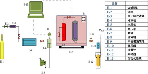 首先,來自儲罐的CO2通過標稱尺寸為1µ的過濾器,以避免任何雜質進入工藝路徑。然后,CO2被引導至冰箱單元,其溫度降至-10℃和60bar。液化CO2使用往復泵加壓,并轉化為殼管式配置的調壓鼓。在這個鼓中,流體溫度被設置為適當的溫度以達到超臨界流體條件。該鼓的設計旨在減少波動,熱交換通過使用溫度精度設置為1K的1000W元件循環水進行。壓力表安裝在調壓鼓的輸出端,以顯示出口流體壓力。之后,液體被引導到裝有10克活性炭和玻璃珠的萃取池。在提取單元的輸入和輸出處安裝了兩個孔隙率為1微米的過濾器,以防止顆粒逸出。細胞中玻璃珠的存在使CO2均勻分布在提取單元內。在用SC-CO2加載萃取池后,將萃取池設置在適當的溫度和壓力下約45分鐘。在靜態階段之后,動態階段從打開采樣閥開始。為了防止閥門凍結,它被包裹在加熱元件中。在動態時間內,使用冰柜將樣品采集溫度保持在0℃以下。每個實驗一式三份進行,圖1顯示了超臨界流體裝置的詳細信息,通過將每個初始活性炭的溶質重量除以計算超臨界回收率。
