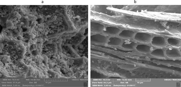 如前所述,通過掃描電子顯微鏡(SEM)評估了未提取和提取的活性炭樣品的結構和表面形態。圖3a、b顯示了活性炭在超臨界再生之前(a)和之后(b)的兩張顯微照片。未處理樣品的顯微照片顯示不均勻且粗糙的表面均勻覆蓋有一層溶質。由于用超臨界二氧化碳萃取獲得的高回收效率,處理過的樣品的結構更加多孔,表面明顯收縮并耗盡溶質。
