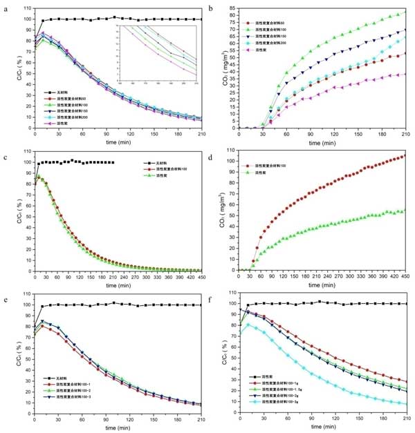 圖3:活性炭樣品去除空氣中甲苯的光催化性能(a)樣品的CO2產率(b)活性炭復合材料和活性炭去除甲苯的性能(c)CO2產率(d)三個循環的穩定性(e)不同用量活性炭復合材料的甲苯去除效率(f)。