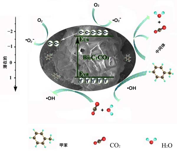 活性炭復合材料在光照射下降解氣態甲苯的光催化反應機制可以解釋如下(圖4)。首先,蜂窩狀活性炭基質吸附并捕獲甲苯分子。然后,在光照下,電子從價帶(VB)激發到負載Bi2O2CO3的活性炭表面的導帶(CB),在VB中留下空穴。活性炭可以充當電子受體以降低電子-空穴對的復合率。因此,Bi2O2CO3中CB上的激發電子可以很容易地轉移到活性炭表面,從而促進光生電荷載流子的分離和遷移。