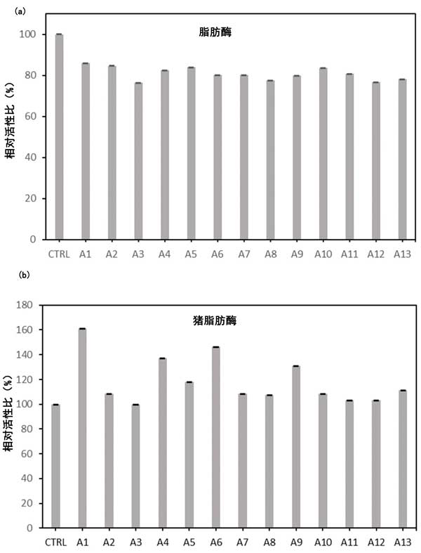 使用十三個活性炭樣本,篩選了兩種類型的脂肪酶,脂肪酶和豬脂肪酶。在2mL離心管中,將緩沖液與1mL游離脂肪酶或活性炭/脂肪酶樣品混合。在對照樣品中,以1:1的比例使用在磷酸鹽緩沖液中制備的脂肪酶溶液(1mL酶在1mL緩沖液中濃度為0.5mg/mL),而對于脂肪酶樣品,使用1:1使用1mL酶溶液對1mL低共熔溶劑的比例。在繼續以下步驟之前,對所有樣品進行渦旋。所有樣品都標記為A1至A13,然后相應地加載0.1g活性炭。將溶液在恒溫混合器中以350rpm孵育2小時。離心2分鐘(8000轉/分)后收集上清液。圖2顯示了脂肪酶和豬脂肪酶在活性炭固定化后的相對活性,在進行脂肪酶測定之前將所有樣品孵育2小時后。添加脂肪酶和豬脂肪酶對照以進行比較。從單因素方差分析,結果顯示R平方為0.9980,均值之間存在顯著差異(p<0.05)。這意味著可以根據記錄的最高值來選擇值。然而,我們觀察到脂肪酶并沒有因活性炭上的固定而增強,盡管活動保持在80%左右。然而,在A1和A2中觀察到最高的紅色陰影。