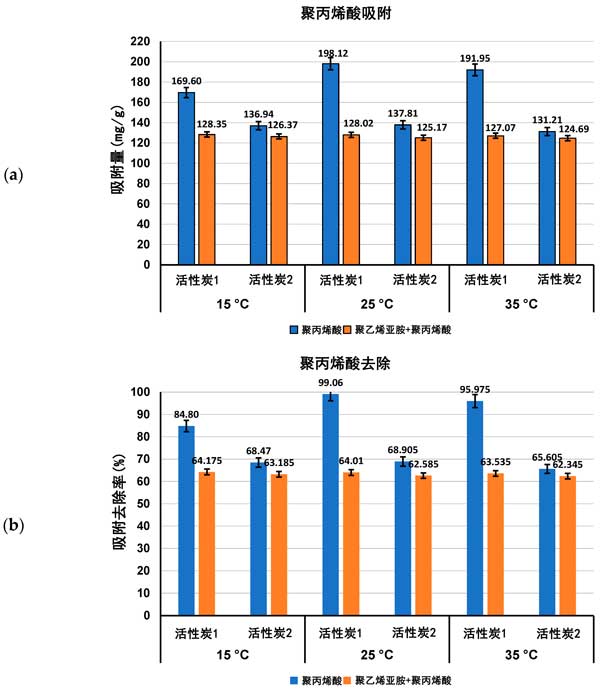 圖1:聚丙烯酸吸附量(a)及其從活性炭表面去除的百分比(b)在單一和混合吸附物系統中,在三個檢測溫度pH值3下。