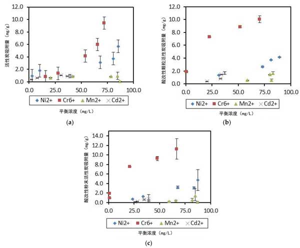 吸附仍然是研究最多和應(yīng)用最多的方法,已證明可提供高去除效率且具有成本效益。吸附分離有幾個(gè)優(yōu)點(diǎn),例如對(duì)痕量金屬離子的高選擇性、成本效益,因?yàn)樗梢允褂秘S富的吸附劑,以及環(huán)境友好的質(zhì)量。一般來說,活性炭表面吸附重金屬離子的機(jī)理是通過表面靜電吸引、表面絡(luò)合和離子交換。對(duì)于未改性的碳表面,表明重金屬離子通過與反應(yīng)后碳基面的π電子相互作用而吸附。在較高的pH值下,酸性基團(tuán)將被非質(zhì)子化,金屬離子將通過表面絡(luò)合與其結(jié)合,這將導(dǎo)致每個(gè)吸附的金屬離子釋放少于一個(gè)質(zhì)子。所有四種金屬離子Ni2+、Cr6+、Mn2+和Cd2+的吸附等溫線如圖2所示。等溫線不是均勻的曲線,很可能是因?yàn)槌爽F(xiàn)有離子之間的排斥和相互作用之外,可用吸附位點(diǎn)上離子之間的競爭。