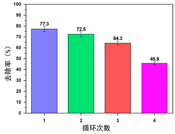 通過回收研究調(diào)查了改性活性炭的再利用以從廢水中去除活性黑5。進(jìn)行實(shí)驗(yàn)時(shí),最初使用100mg/L活性黑5和0.8g/L的改性活性炭,pH值為2。在第一個(gè)循環(huán)之后,使用0.01M/NaOH溶液對所使用的改性活性炭顆粒進(jìn)行處理大約2小時(shí)。此后,用蒸餾水沖洗顆粒以除去任何殘留的堿。選擇被認(rèn)為可接受的重復(fù)時(shí)間,以便能夠在后續(xù)循環(huán)中重復(fù)使用吸附劑。研究結(jié)果如圖3所示。在用1M/NaOH處理成功再生后,解吸的改性活性炭能夠重復(fù)使用多達(dá)四個(gè)循環(huán)以去除活性黑5。活性黑5的去除百分比在第一個(gè)循環(huán)中約為77.3%,在第四個(gè)循環(huán)后下降至約45.9%。總的來說,這項(xiàng)研究證明了將改性活性炭吸附劑重復(fù)使用四個(gè)循環(huán)以從廢水中去除活性黑5的潛力。