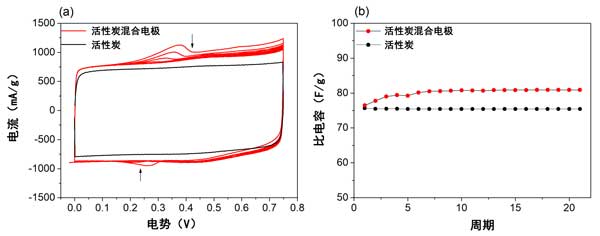 通過評估電化學性能,初步測試了活性炭復合材料作為混合電極的潛在應用。為此,通過將浸泡在1M/H2SO4電解質中的隔膜夾在兩個相同的電極(活性炭或混合材料)之間來組裝對稱電池。圖3a顯示了活性炭和混合材料在20mV/s恒定掃描速率下的循環極化(CP)曲線。由于雙電層電容(EDLC)的影響,交流對稱電池的CP曲線形狀為矩形。另一方面,活性炭混合電極觀察到準矩形CP曲線NPs對稱細胞,具有源自納米銀的各種氧化還原波,與矩形(電容)包絡重疊。這種CP結構表明法拉第和EDLC兩種電荷存儲機制的共存。值得注意的是,隨著循環次數的增加,觀察到的銀波變得更小并且變得難以察覺,這表明存在一定程度的不穩定,正如對游離多金屬氧酸鹽納米銀所觀察到的那樣。白銀波浪的減少之間存在相關性(圖3a)在前幾個周期內,根據CP面積計算出的比電容有所增加(圖3b)。這可以通過氧化銀薄層與銀的比電容差異來解釋。盡管如此活性炭混合電極的比電容略高于裸活性炭電極,活性炭的比電容為75F/g,活性炭混合電極在20次循環后達到81F/g。該結果表明,混合材料具有電活性,并且在對稱超級電容器配置中超過了一定程度的交流電。活性炭和混合電極電池的比電容隨著電流密度的增加而降低。對于活性炭混合材料在掃描速率為2mV/s時最高值為83.5F/g,在掃描速率為50mV/s時進一步下降至77.5F/g。高掃描速率下比電容的降低歸因于電解質離子的低擴散。由于時間限制,高倍率充放電過程中電解液中的離子運動始終受到擴散限制,僅利用外層活性表面進行電荷存儲。減慢掃描速率可以讓電解質更徹底地滲透到孔隙中,并與電極材料的內表面有更多的接觸,從而導致電極表面存儲更多的電荷(更大的電容)。