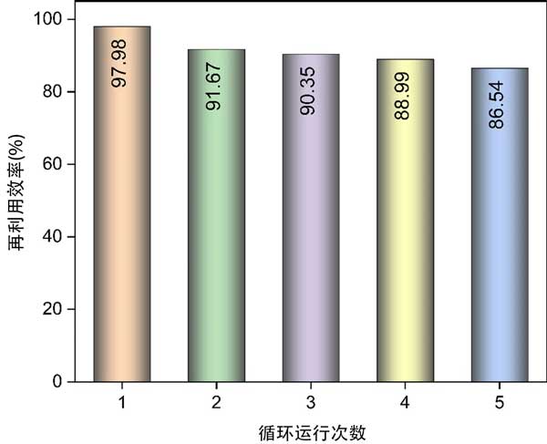 吸附劑的可重復使用性和吸附穩(wěn)定性在評估所開發(fā)方法的實際適用性方面起著至關重要的作用。事實上,吸附劑的可重復使用性能是實際應用的首要標準,并影響吸附過程的總體成本。活性炭苯蒸汽吸附的再利用效率是在五個連續(xù)的回收循環(huán)后確定的。如圖4所示,經過五次連續(xù)回收過程后,活性炭苯蒸氣的再利用效率為86.54%。強大的可重復使用性和吸附穩(wěn)定性表明活性炭吸附劑和苯吸附物之間存在范德華力或π-π相互作用。相反,不完全的再生過程可歸因于吸附表面上永久鍵的形成,導致吸附基團的不可逆轉化。換句話說,一些在再生過程中未解吸的化學結合吸附物可能會堵塞孔隙,導致殘留物形成。