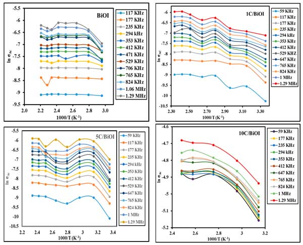 圖4:溫度對BiOI、1C/BiOI、5C/BiOI和10C/BiOI納米復(fù)合材料在不同頻率下交流電導(dǎo)率的影響。