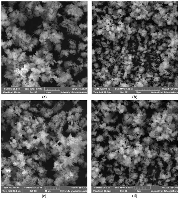 活性炭由各種富含碳的材料制成,例如煤、椰殼或木材,通過活化過程可提高其孔隙率和表面積。這種高表面積加上孔隙網絡使活性炭能夠吸附各種物質。其吸附能力源于物理吸附(污染物受范德華力控制)和化學吸附(碳表面和污染物分子之間發生相互作用)。圖1a–d中的SEM 圖像用于說明吸附劑的表面形貌。這些SEM圖像顯示活性炭的形貌為無定形。