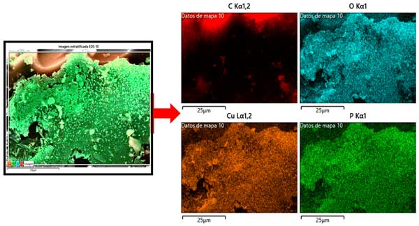 圖1:浸漬氧化銅的活性炭的FESEM圖像對應的元素映射分析。