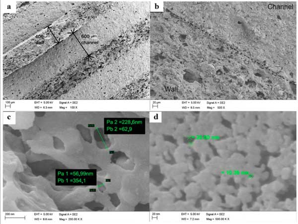 活性炭SEM圖像揭示了材料的孔隙性質。圖1a、b中的低放大圖像顯示了具有擠壓(墻)和內部(通道)結構差的單體縱向部分的主要形態,其中高放大(圖1c、d)圖像分別顯示了小宏觀和中孔直徑范圍內孔內部結構的主要形態。