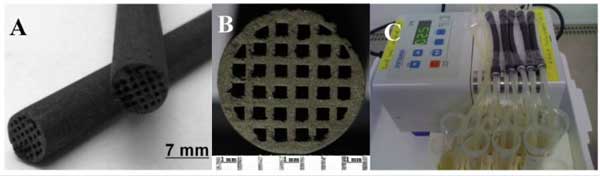 圖2:活性炭整體材料。(A)活性炭的外觀尺寸:長度10厘米,直徑6.9±0.1毫米;(B)截面幾何尺寸:通道數量32個,邊長0.6毫米;壁直徑0.4毫米;(C)用于活性炭整體材料LPS吸附研究的流動循環系統。