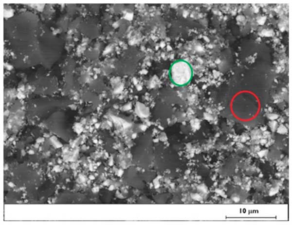 圖1:活性炭混合物顆粒的SEM圖像(綠色圓圈對應重晶石顆粒,紅色圓圈對應活性炭顆粒)。