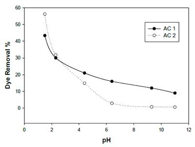 考察了溶液酸度對活性炭對檸檬黃吸附的影響,初始pH范圍為1.5〜11.0,見圖1。吸附研究在37℃進行。染料的典型pH值與百分比的去除在較高的pH值下顯示出染料百分比的顯著降低。觀察到pH值高于6.0的染料吸收的減少,此后觀察到吸附量沒有變化。對于AC1和AC2,在pH1.5分別達到染料的最大攝取(43.4和56.2%)。因此,選擇pH 1.5作為進行后續研究的最佳值。該pH值也是人類胃的近似pH值。得到的結果表示因質子化而增加中和吸附劑表面上的負電荷,這有利于擴散并提供吸附劑的更多活性表面,由此在其表面處產生更大的吸附。溶液的pH控制吸附劑和被吸附物之間的靜電相互作用。隨著pH的增加,去除百分比的降低可能是由于去質子化,這阻礙了吸附劑和山梨酸之間的靜電力,導致吸附能力降低。pH對AC吸附容量的影響與以前水溶液中吸收酒石黃的結果是一致的。