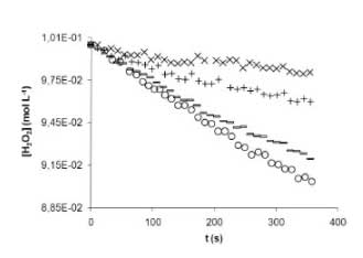 為了獲得關(guān)于活性炭的化學(xué)性質(zhì)的更多信息,就其酸性-堿性和氧化還原性質(zhì)而言,研究了溶液的pH和過氧化氫中活性炭表面的化學(xué)修飾的影響。 。對于該反應(yīng)混合物與過氧化物濃度0.100mol L的固定組合物-1和CAT等于2,00x10 -3克·毫升-1 在298K的溫度下發(fā)現(xiàn):在2-10個(gè)pH單位的溶液范圍內(nèi),初始反應(yīng)速率沒有顯著變化。該結(jié)果與Bohem滴定法給出的活性炭中官能團(tuán)的組成一致,其中活性酸基團(tuán)與堿性基團(tuán)相比是非常低的比例。強(qiáng)氧化劑,如高錳酸鉀和過氧化氫,會大大改變影響過氧化氫的表面(圖1),從而可以推斷活性炭表面存在還原基團(tuán)作為過氧化氫的活性位點(diǎn)。活性炭表面的化學(xué)處理按以下方式進(jìn)行:用HNO3濃度5mol L-1 6個(gè)小時(shí),用KMnO 4濃度0.08mol L-1在酸H 2 SO 4 濃度為0.5mol L-1 4小時(shí)用H 2 ö 2 的30%72小時(shí)。在每次處理結(jié)束時(shí),將活性炭置于索氏提取器中一周,直到保證恒定的pH值。最后將活性炭在110℃下干燥至不再減輕重量,然后儲存在干燥器中。