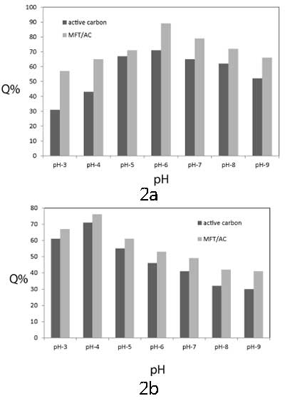 初始pH的影響:初始pH對鉻和鋅離子的去除效率的影響在pH(3-9)的范圍內(nèi)進行研究,并在(圖2a和2b)中表示。通過在含有50mL初始濃度為100mg / L的50mL重金屬溶液的燒杯中,將0.05g MFT/活性炭或活性炭浸泡在25℃下,并且以210KHz聲強度,以7.7W /厘米1小時。如圖2所示,由于pH影響金屬離子和MFT官能團的化學(xué)性質(zhì),MFT / 活性炭從水溶液中去除中的金屬離子是pH依賴性過程。在所有pH值范圍內(nèi),MFT / 活性炭的去除系數(shù)大于活性炭的去除系數(shù)。對于鉻離子,去除Cr 3+的系數(shù)離子從pH3增加到6,在pH6達(dá)到最大值。在pH = 6時,約91%的鉻離子從溶液中去除。在pH范圍(7 - 9),去除系數(shù)略有下降。對于鋅離子,去除系數(shù)在pH4時達(dá)到最大值,鋅離子去除率達(dá)到74%,然后明顯下降。在中性或微酸性介質(zhì)中,吸收可能是由于樹脂 - 金屬離子絡(luò)合物的穩(wěn)定形成,由于配位羧酸根釋放H+,可能導(dǎo)致介質(zhì)酸度增加。在較高的pH值下,重金屬離子將水解成Cr(OH)+和Zn(OH)+,因此,重金屬正電荷減少到+1,這使得與螯合劑的低相互作用除了金屬氫氧化物可以沉淀。