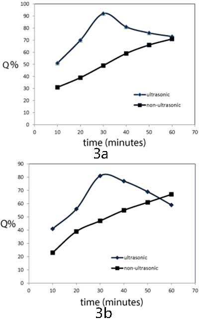 在沒有超聲波的情況下,MFT / 活性炭對兩種重金屬的去除系數(shù)隨著去除時間的增加而連續(xù)增加,并且在去除過程60分鐘后,大約71%的Cr離子和60%的Zn離子被去除。當(dāng)超聲波在除去過程中使用時,對于兩種重金屬,去除系數(shù)隨著超聲處理時間的增加而增加,在0-30分鐘范圍內(nèi),對于鉻離子為92%,對于鋅離子為81%,參見(圖3a和圖3b)圖3b)。在超聲處理(40-60分鐘),去除系數(shù)大大變得相當(dāng)于非超聲波解決方案(鉻)和低于非聲波解決方案(鋅)獲得的。在較早的超聲波處理時間內(nèi),借助超聲波減壓,MFT與重金屬的配位作用增強。而隨后的超聲處理時間(從30-60分鐘),由于超聲波的劇烈效應(yīng),溶液中產(chǎn)生的高壓和高溫可降低MFT的粒徑。這減少了金屬離子和MFT之間已經(jīng)形成的螯合鍵的可能的螯合和破壞,MFT負(fù)責(zé)減少重金屬離子的去除。