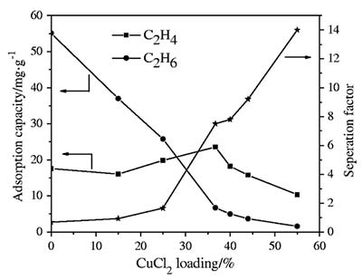 隨著氯化銅含量的增加,活性炭吸附劑上乙烯和乙烷分離的分離因子增加。同時,在氯化銅含量為36.7%時出現乙烯的最大吸附量。很明顯,π-絡合作用占主導地位。