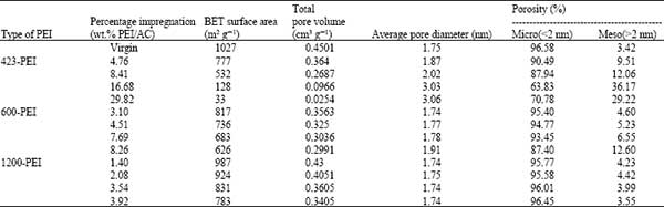 表1圖:原始和PEI浸漬活性炭的結構特征。