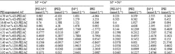 為了進一步闡明聚乙烯亞胺浸漬量對活性炭上金屬離子平衡吸附容量的影響,本文計算和比較了PEI浸漬AC上重金屬離子吸附的相互作用參數(表示為PEI)。應該指出的是,I PEI不等于絡合常數,只計算比較重金屬和PEI浸漬的活性炭表面之間的相互作用程度。