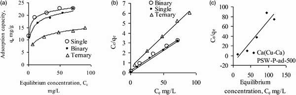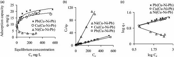 圖2.初始pH值為5的活性炭的三元溶質,Cu(II),Ni(II)和Pb(II)的Langmuir非線性(a),線性(b)和Freundlich(c)等溫線而它們的初始濃度變化,從<0到≤600mg L-1。(分析Ni樣品的濃度范圍高達305mg L -1)。