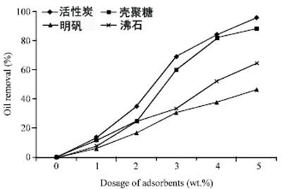 通過改變吸附劑的重量,以100rpm的混合速率,1小時(shí),分析不同吸附劑用量(wt。%)對(duì)活性炭與沸石相比對(duì)MEA去除殘留油的影響。混合時(shí)間,在25-30℃的溫度下接觸時(shí)間為1小時(shí)。測(cè)試在樣品的原始pH下進(jìn)行,即11.21。在CO 2去除單元系統(tǒng)中根據(jù)需要維持pH水平。圖1顯示了使用活性炭和沸石從MEA廢水中去除殘留油的百分比。從圖1中可以看出觀察到,在最高吸附劑用量(5重量%)下,活性炭與其他物質(zhì)相比顯示出最高的殘油去除率。活性炭成功除去87%的殘油,沸石為46%。可以得出結(jié)論,活性炭最好比其他吸附劑更好地除去殘油。