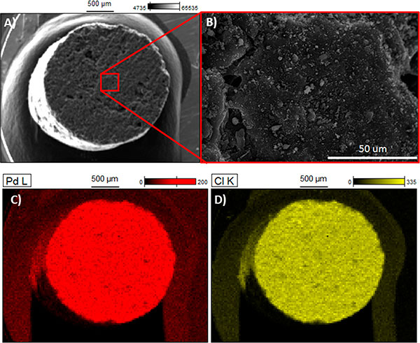 圖3:(A)活性炭的SEM分析,(B)選擇區域的放大率,(C和D)吸附氯化鈀(II)絡合離子后的EDS截面分析。