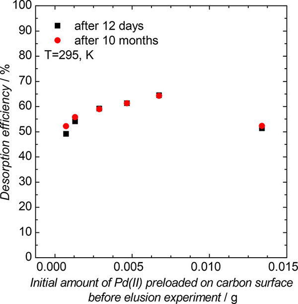 在活性炭表面存在二氯化鈀的情況下,應該可以根據方程解吸它。因此,解吸試驗在室溫(20℃)進行,使用100厘米3鹽酸(濃度為1mol·kg-1)或100厘米3的高氯酸鹽酸(濃度1mol.kg-1)。必須提及的是,吸附實驗在pH等于1下進行,而汽提過程在pH等于0下進行。由鈀(II)負載的活性炭樣品取自先前的吸附實驗。通過過濾將預加載的活性炭與溶液分離,然后在60℃下干燥。接著,將干燥的預加載的活性炭與鹽酸溶液混合。解吸試驗進行約10個月。在前2天,觀察到溶液中鈀(II)濃度的快速增加,最終在12天后獲得恒定值。這些結果如圖4所示作為黑色方塊。為了確保這確實是最終的平衡,樣品在接下來的10個月內留在溶液中。在此時間之后獲得的值顯示為紅點。過量的鹽酸是顯著的,它應該足以溶解二氯化鈀。結果表明,平衡狀態不受時間影響,表明觀察到的狀態是最終狀態。似乎在該實驗期間,只有約50-65%的鈀(II)物質可以從活性炭表面洗脫。如上所述,施加過量的鹽酸。因此,一方面,不完全洗脫可以通過Pd2 OCl2的形成來解釋或活性炭表面上的另一種鈀(II)化合物。另一方面,它可能僅僅與出現與初始狀態不同的新平衡狀態有關。為了切斷推測,進行簡單的第二次解吸試驗,其中使用來自第一次解吸試驗的活性炭。實驗條件和程序與第一次解吸試驗期間的相同。觀察到鈀(II)的洗脫再次發生。在最初的24小時后,高達17%的剩余鈀(II)被解吸,而在2個月后,總解吸效率達到98.4%的水平。
