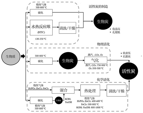 一般而言,活性炭吸附劑可以由其組成中具有高比例碳的任何前體制造。因此,生物質(zhì)材料是活性炭吸附劑的理想前體。在這項研究中,生物質(zhì)在熱處理后得到生物炭,生物炭經(jīng)過進一步活化,而在活化步驟后獲得活性炭。常見的生物質(zhì)材料如橄欖核等等。圖2顯示了生物質(zhì)的活性炭制造方法。生物炭通常在碳化時制備,而活性炭需要使用物理和化學活化產(chǎn)生更加發(fā)達的孔隙。合成的活性炭的孔隙率,表面化學和產(chǎn)率高度依賴于起始生物質(zhì)組成和合成中使用的操作條件。