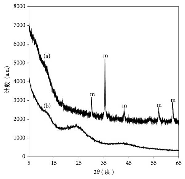 儀器技術用于提供關于磁性改性活性炭的組成和結構的信息。因此,進行X射線衍射(XRD)研究以確定固體中存在的氧化鐵形式。從XRD衍射圖如圖1(a)中顯示,對應于Fe的特征衍射線標記為“m”的信號,根據粉末衍射標準。20°和30°之間觀察到2的寬帶信號θ角(圖1(b))是活性炭原料的特征。