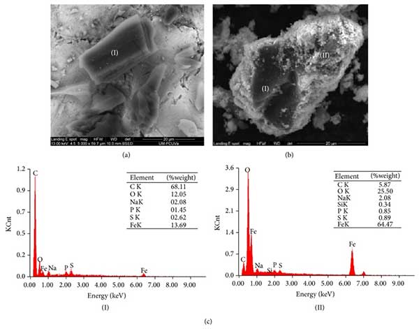 用掃描電子顯微鏡(SEM)對活性炭的形態研究顯示了具有不均勻的顆粒的均勻相尺寸大于20 μM(圖2(a))。顯微照片與未經改性活性炭進行的SEM研究一致。在合成載體的情況下,可以看出活性炭被較小尺寸的相覆蓋(圖2(b))。用能量色散光譜證實了這一點(圖2(c)),顯示了(I)部分的活性炭含量較大,而區域(II)的Fe含量較高,因此得出的結論是磁鐵礦相覆蓋活性炭。