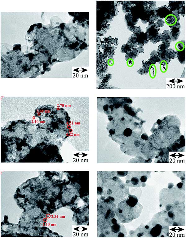 活性炭負載鈀催化劑的TEM比較顯示在圖1。左:原始活性炭,右頂部和中部:在300°C和底部:400°C下進行碳熱處理后,這會導致活性炭的顆粒增長,但之后聚集體大部分缺失孤立的較大平均尺寸增大的鈀微晶留在活性炭表面。右上:在300℃處理后的活性炭負載鈀的調查圖像,其中的橢圓形綠色標記突出顯示在400℃催化劑上不存在的殘余聚集體。顯示貴金屬實體的形狀,尺寸和形態之間的明顯差異。對于活性炭負載鈀,在多孔高表面積活性炭載體上/中存在大部分分離的初級顆粒。對于活性炭催化劑,主要存在線性聚集鏈和支化聚集體,在表面具有一些聚集體。熱處理導致大部分分離的初級顆粒尺寸增大,僅剩下少量聚集體或附聚物。